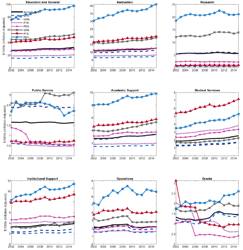 These results suggest that, from the institution’s perspective, amenities spending cannot be considered purely “wasteful”—because such spending helps attract students, regardless of whether it improves educational outcomes. Naturally, the willingness of students and families to pay higher tuition to receive amenities depends both on their financial capacity to do so (arising from their income and from their ability to borrow) and on the value they place on such amenities. One view is that such noninstructional spending is purely a form of consumption, although some studies find that this is not the case. In particular, multiple studies find that student services expenditures are a strong determinant of graduation probabilities for students with low college admissions test scores, whereas instructional spending matters more for high-achieving students and for students who major in a STEM field.18See Douglas A. Webber and Ronald G. Ehrenberg, “Do Expenditures Other Than Instructional Expenditures Affect Graduation and Persistence Rates in Higher Education?,” Economics of Education Review 29 (2010): 947–58; and Douglas A. Webber, “Expenditures and Postsecondary Graduation: An Investigation Using Individual-Level Data from the State of Ohio,” Economics of Education Review 31 (2012): 615–18. In other words, some nonacademic spending may not be appropriately labeled as spending for “amenities” but rather as spending for services that complement direct instructional resources.