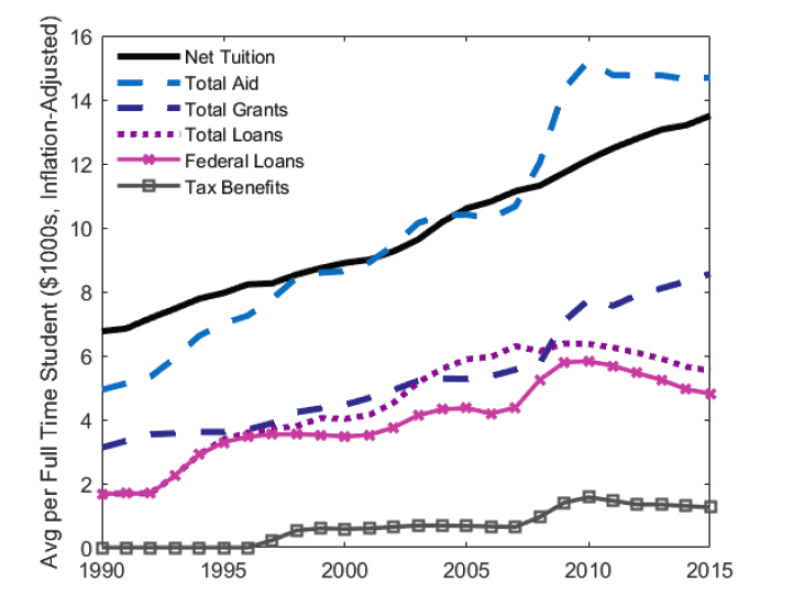 The academic literature thus far has found mixed and at times conflicting effects of financial aid expansions on tuition. For example, one study estimates that a 10% increase in the size of maximum Pell Grants leads institutions to raise in-state tuition by 4.8%, which amounts to tuition that is $58 higher for every $100 in Pell increases.19See Michael J. Rizzo and Ronald G. Ehrenberg, “Resident and Nonresident Tuition and Enrollment at Flagship State Universities,” in College Choices: The Economics of Where to Go, When to Go, and How to Pay for It, ed. Caroline H. Hoxby (Chicago and London: University of Chicago Press, 2004). The study’s authors find that higher maximum Pell Grant awards have no such effect on out-of-state tuition. By contrast, a different study comes to the opposite conclusion, finding that out-of-state tuition rises by $804 per $1,000 increase in the average Pell Grant award, while tuition at private universities rises by $864.20 See Larry D. Singell and Joe A. Stone, “For Whom the Pell Tolls: The Response of University Tuition to Federal Grants-in-Aid,” Economics of Education Review 26, no. 3 (2007): 285–95. Another study finds a nearly $1 increase in net tuition (via reductions in institutional aid) for every additional $1 of tax-based aid.21 See Nicholas Turner, “Who Benefits from Student Aid? The Economic Incidence of Tax-Based Federal Student Aid,” Economics of Education Review 31, no. 4 (2012): 463–81. Multiple recently published studies also find large pass-through of federal student loans to tuition. Quantitatively, one of these studies finds that $0.60 of every $1 in subsidized lending and $0.20 of every $1 in unsubsidized student loans gets passed through into higher tuition.22See David O. Lucca, Taylor Nadauld, and Karen Shen, “Credit Supply and the Rise in College Tuition: Evidence from the Expansion in Federal Student Aid Programs,” Review of Financial Studies 32, no. 2 (2018): 423–66. Separate evidence indicates that the effects may be even larger at for-profit schools.23See Stephanie Riegg Cellini and Claudia Goldin, “Does Federal Student Aid Raise Tuition? New Evidence on For-Profit Colleges,” American Economic Journal: Economic Policy 6, no. 4 (2014): 174–206. In another study, 42% of the entire increase in net tuition from 1987 to 2010 can be attributed to student loan policy changes, chiefly the introduction of unsubsidized loans in 1992, which greatly increased total loan limits.24 See Gordon and Hedlund, “Accounting for the Rise.” At the state level, economists have estimated the impact of the introduction of Georgia’s HOPE scholarship in 1993. This scholarship pays for full tuition and fees for Georgia students with at least a B average who are attending an in-state public college. The evidence indicates that colleges responded to the policy by raising tuition by as much as $0.30 for every $1 of scholarship money. 25 See Long, Bridget Terry, “How do Financial Aid Policies Affect Colleges?” Journal of Human Resources, Vol. 39(4), pp. 1045 – 1066 In contrast to the previous findings, a commissioned report for the 1998 reauthorization of the Higher Education Act concludes that “the models found no associations between most of the aid variables and changes in tuition in either the public or private not-for-profit sectors.”27
