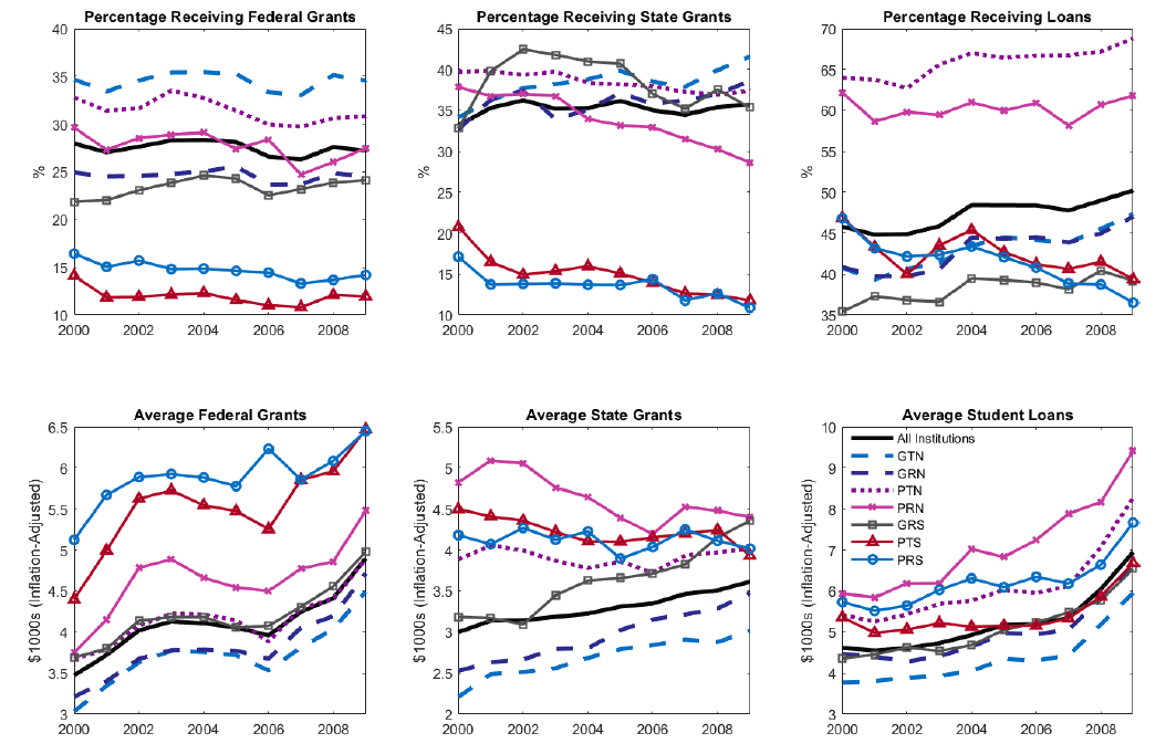The increase in aid has occurred across all institution types, though not uniformly. For example, the top row of figure 7 reveals that the percentage of students receiving federal grant aid changed little during the decade between 2000 and 2010, but students at public colleges increasingly received state grants and loans. Moreover, the average value of grants increased by more than $2,000 per student during that decade, with student loans increasing by even more.