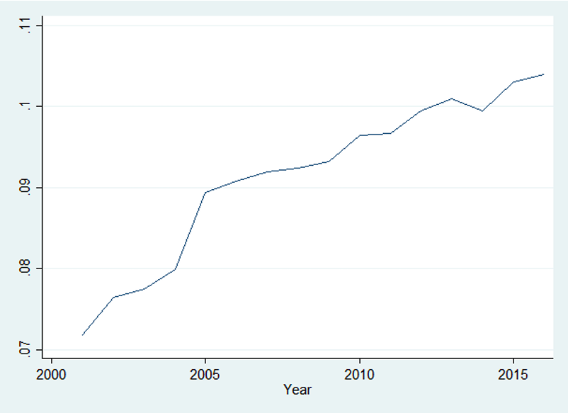 Figure 2 shows the temporal and geographic variation in the sanctuary policy index, which ranges from 0 to 1.6. It takes the value of 0 when the state has not adopted a state-wide Trust Act, plus no county in the state has enacted a local sanctuary policy. It takes the value of 1.6 when the state has a state-wide Trust Act, and 60 percent of its population is covered by a county-level sanctuary policy in that year.