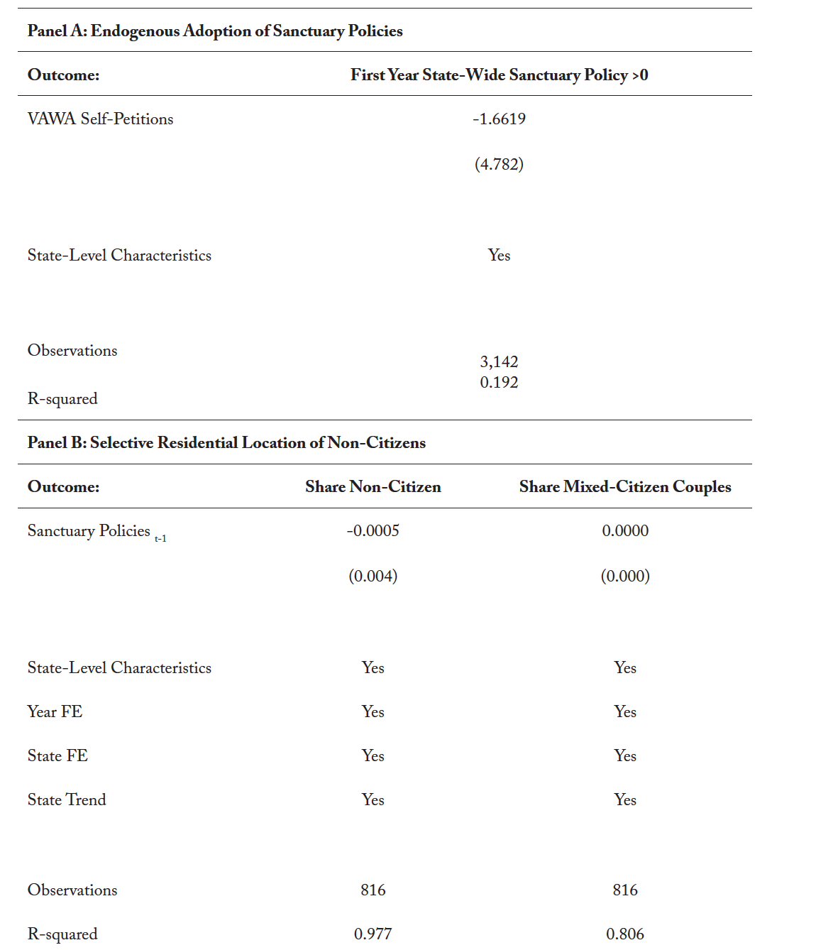 In sum, whether sanctuary policies increase (via increased reporting by victims) or decrease (via reduced incidence of domestic violence) VAWA self-petitions remains an empirical question.