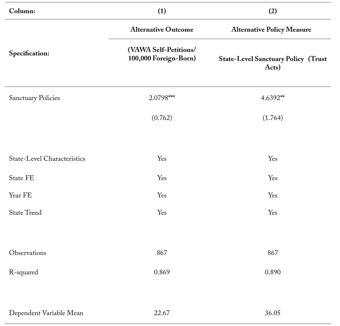 As noted earlier on, not all sanctuary policies have the same geographic scope. In column (2) of Table 5, we experiment with using, instead, a simpler dichotomous variable that equals 1 for the years during the state had a Trust Act in place. We continue to find evidence of sanctuary policies significantly raising the VAWA self-petition rate. Specifically, the adoption of a Trust Act (or statewide sanctuary policy) increases the VAWA self-petition rate by 4.63 percent.