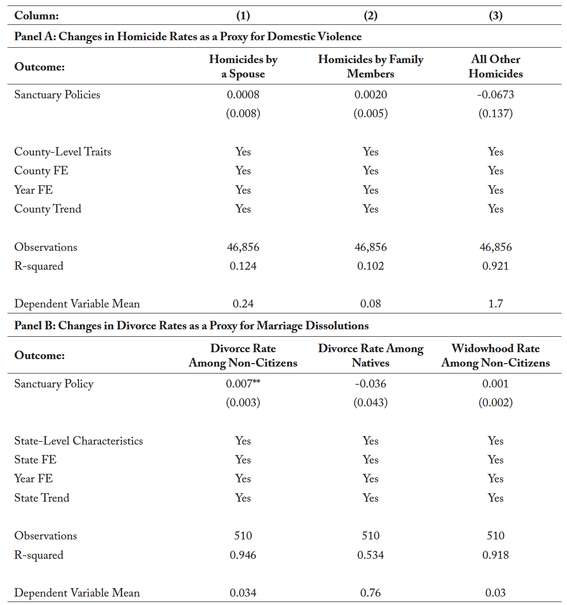 In this paper, we identify the impact that sanctuary policies have on domestic violence reporting by immigrants, as captured by the VAWA self-petition rate. Specifically, exploiting the temporal and geographic variation in the adoption of sanctuary policies, we show how the adoption of sanctuary policies raises the rate of VAWA petitions by 2.24 percent. Additionally, we provide suggestive evidence of the channel through which this impact is likely taking place—namely, through victims’ increased willingness to report cases and leave their abusers.