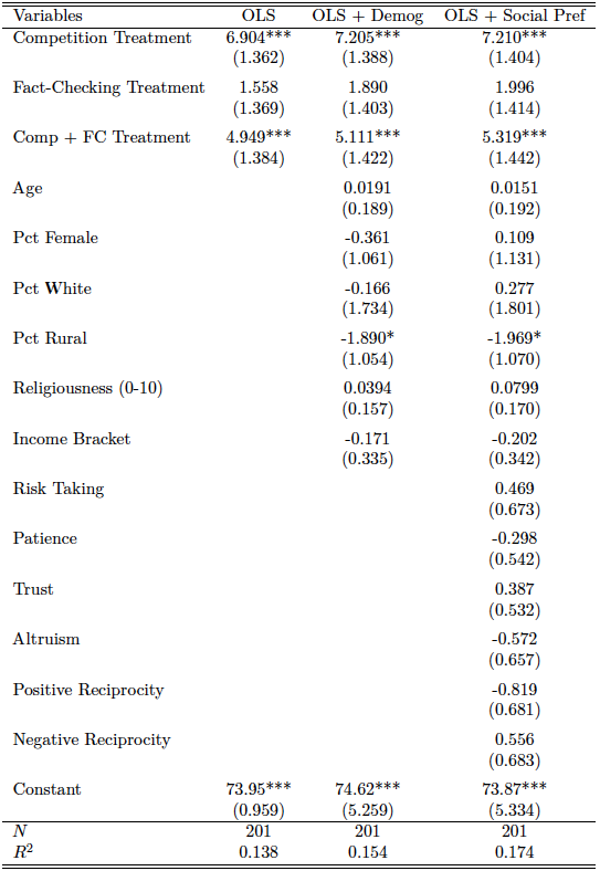 We ended up recruiting 201 subjects and found a that competition had a large effect on accuracy choice while fact-checking had only a marginal effect. Specifically, the effect size of the competition treatment had a power of 99.7 percent, while the effect size of the fact-checking treatment had a power of only 23.3 percent. For the competition plus fact-checking treatment, we got a power of 98.1 percent.