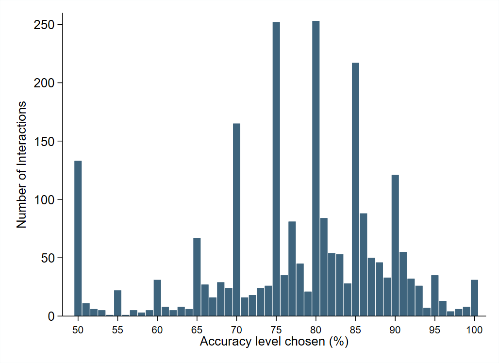 This histogram contains 2,340 accuracy choices made by senders (note there are more senders than interactions because some interactions had two senders). For some reason, accuracy levels that were multiples of five were more popular than their neighbors.