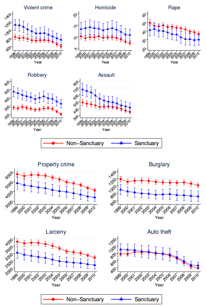 Note: Each graph shows the mean crime rate for both sanctuary and non-sanctuary cities with 95% confidence intervals. The crime rate is defined as the number of reported crimes per 100,000 population and weighted by city population. The group of sanctuary cities consists of every city where a sanctuary policy was adopted by 2010. Hence the composition of the two groups does not change over time. However, due to this definition, some of the “sanctuary” cities had not adopted the policy in the early years. The homicide rate in 2001 does not count the victims from the September 11 attacks. Cities in Illinois are treated as missing for the forcible rape rate since the definition of forcible rape used in Illinois does not comply with the UCR guidelines.
