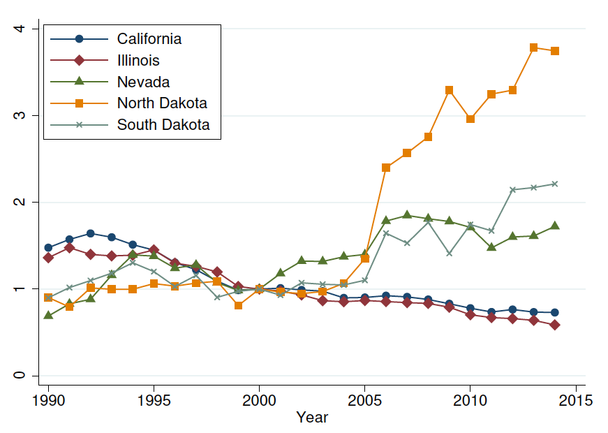 To control for time effects, Martínez-Schuldt and Martínez (2019) assumed linear and quadratic time trends common to all cities. However, as I show in Figure 1, although every crime rate decreases over time in their sample period, it sometimes shows kinks, and so linear and quadratic forms cannot capture the trend of crime rates well. Moreover, when the crime rates are divided by regions, they show a different time trend. Figure 2 shows the change in violent crimes by state from 1990 to 2014 (the number is normalized to the 2000 level). Although California and Illinois show a decreasing trend, Nevada, North Dakota, and South Dakota show an increasing trend. In 2014, North Dakota faced 274% more violent crime compared to the 2000 level, while Illinois faced 41% less. Hence, to evaluate the policy effect, we need to capture the geographically heterogeneous trends in crime rates. My paper uses a model with a city-specific linear time trend or state-year fixed effects, which are more flexible to capture the heterogeneous time trends. Lastly, Martínez-Schuldt and Martínez (2019) used a mean crime rate over three years as a dependent variable to smooth annual fluctuations. However, the policy effect is underestimated when there is an immediate effect from the year of implementation. This could be more problematic if the policy effects begin from the next year after implementation. The results of this paper show that the sanctuary policy has a lagged effect. Hence, it is likely that Martínez-Schuldt and Martínez (2019) underestimated the coefficients.