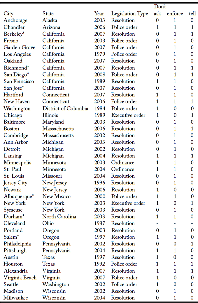 The list by the NILC has some advantages over other lists. One is that there is a brief description of the policy for each city, which helps to identify the date of implementation and categorize its type of policy. However, one disadvantage is that the list was last updated in 2008. Following O’Brien et al. (2019) and Martínez et al. (2018), I checked each document and made a list of sanctuary cities (see Table 1).9Sanctuary policies could be determined by state and county levels as well. In the list from the NILC, 4 states (Alaska, Montana, New Mexico, Oregon) and 7 counties (Sonoma County, CA; Cook County, IL; Prince George’s County, MD; Butte-Silver Bow County, MT; Rio Arriba County, NM; Marion County, OR; Dane County, WI) are considered to be sanctuary jurisdictions. However, local police enforcement is operated under city governments. Appendix B.2.1 investigates how the results change when including state and county level policies.1010According to Kittrie (2006), sanctuary policies fall into three types (or combinations of these types): (1) don’t ask, (2) don’t enforce, and (3) don’t tell. A don’t ask policy limits inquiries related to nationality or immigration status. A don’t enforce policy limits arrests or detention for immigration offenses. A don’t tell policy limits information sharing with federal officials. I categorize each policy based on the description in National Immigration Law Center (2008). For example, Executive Order 41 in New York prohibits police officers from inquiring about or disclosing a person’s immigration status, including witnesses and victims of crimes, except during the investigation of illegal activity other than a violation of immigration law. The policy is considered as the combination of don’t ask and don’t tell.