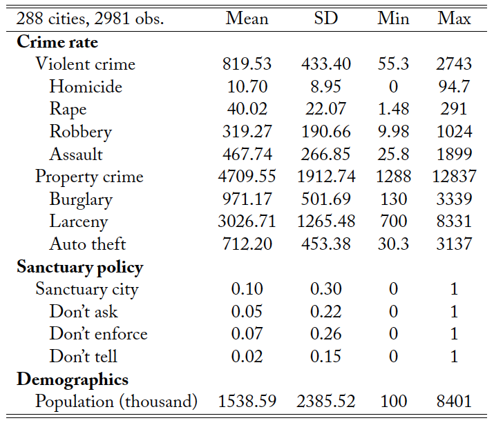 Note: The crime rate is defined as the number of reported crimes per 100,000 population. Crime rates and demographics are weighted by city population. “Sanctuary city” takes a value of one if an observation is after the sanctuary policy has employed. In total, there are 2969 observations, but there are some missing values in the UCR except homicide and robbery. The number of observations for each crime category is assault (2980), auto theft (2975), burglary (2979), larceny (2971), property (2964), rape (2903), and violent (2902).