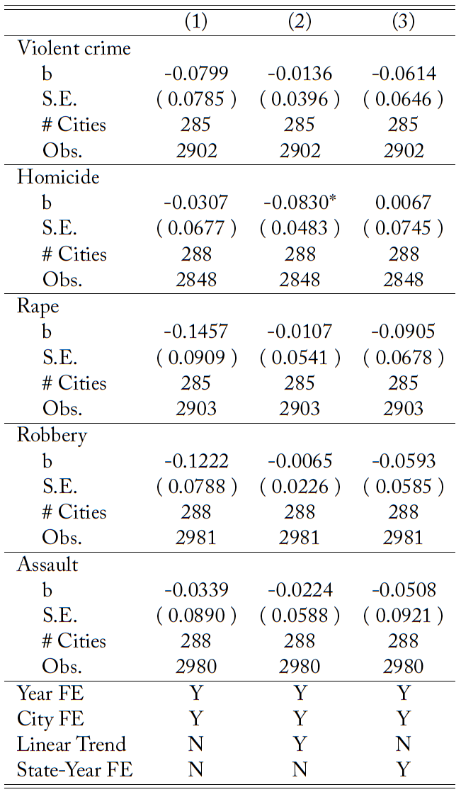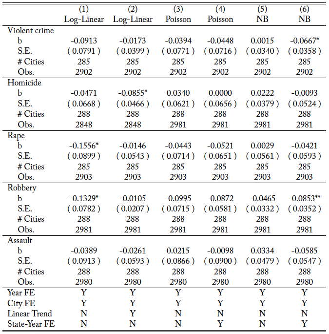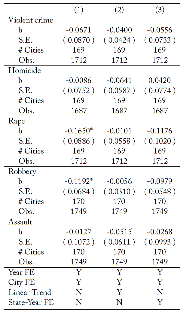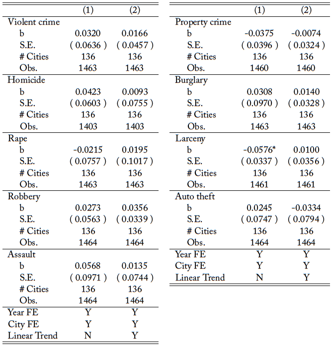 Note: Dependent variables are log of crime rates. Linear trend is the city-specific trend.