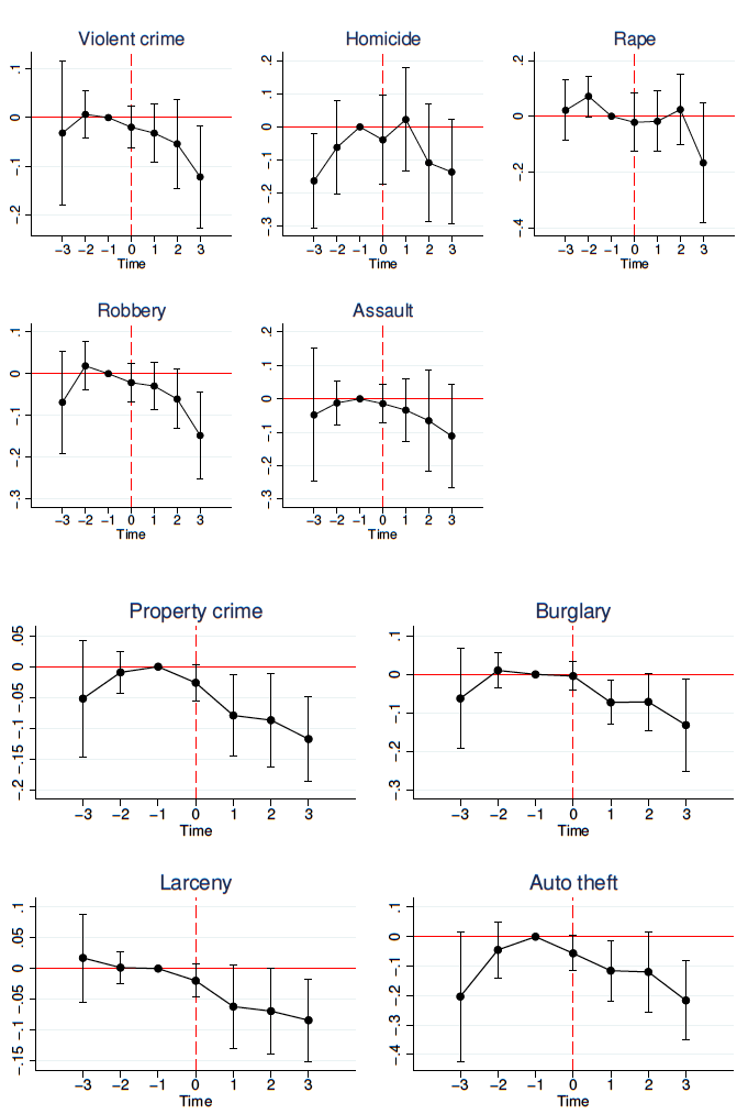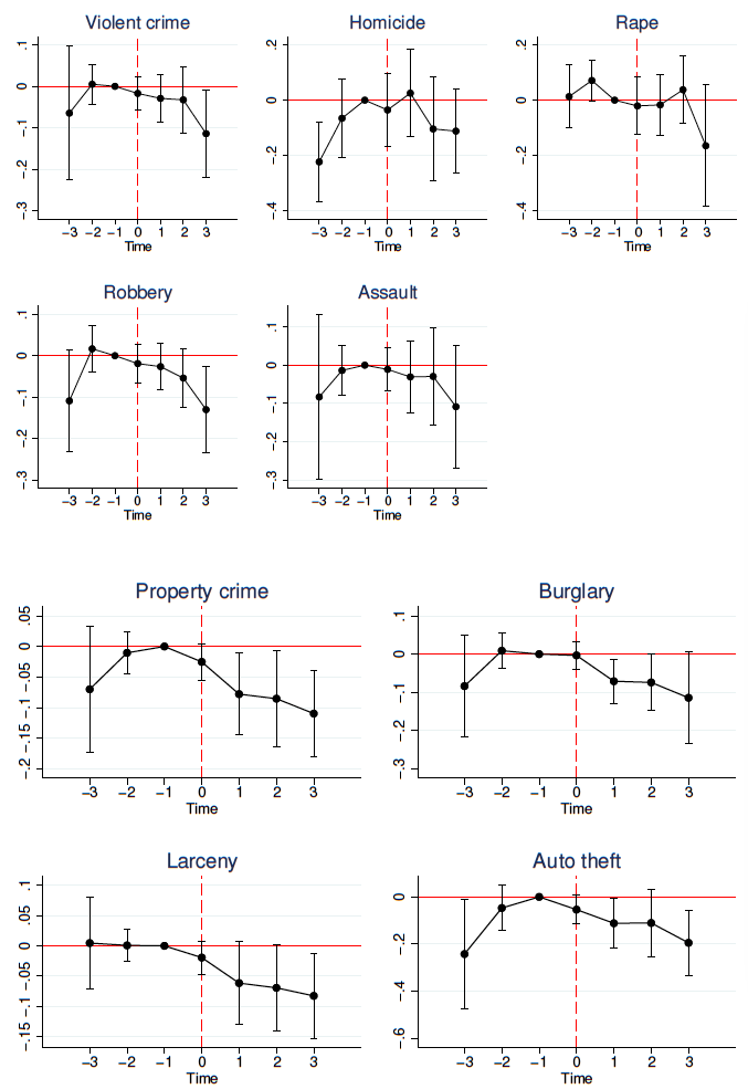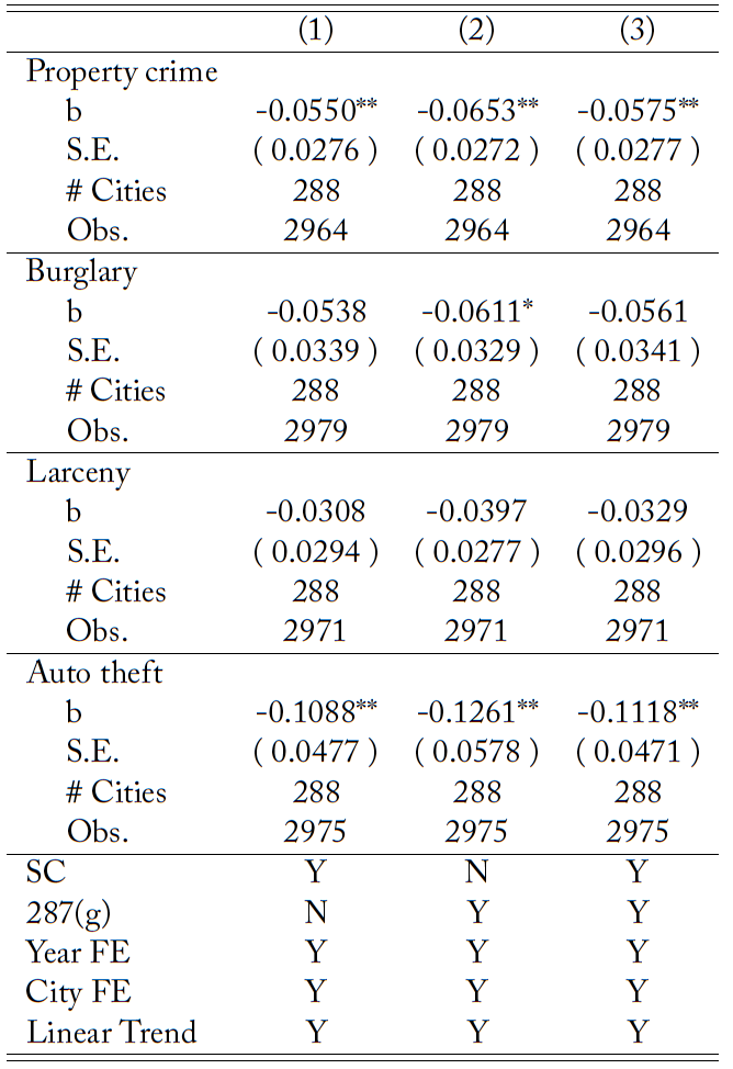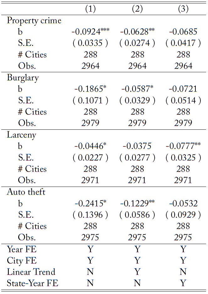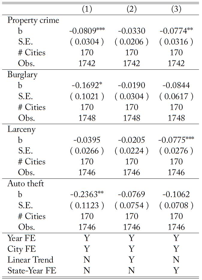 Finally, the third column controls for the time trend as state-year dummies instead of linear trends. The state-year dummies cause the effects on the property crime and auto theft rates to vanish but make the larceny rate significant. The property crime rate shows a similar effect in terms of magnitude, but the standard error is relatively high. The auto theft rate becomes insignificant due to a smaller point estimate and the high standard error.