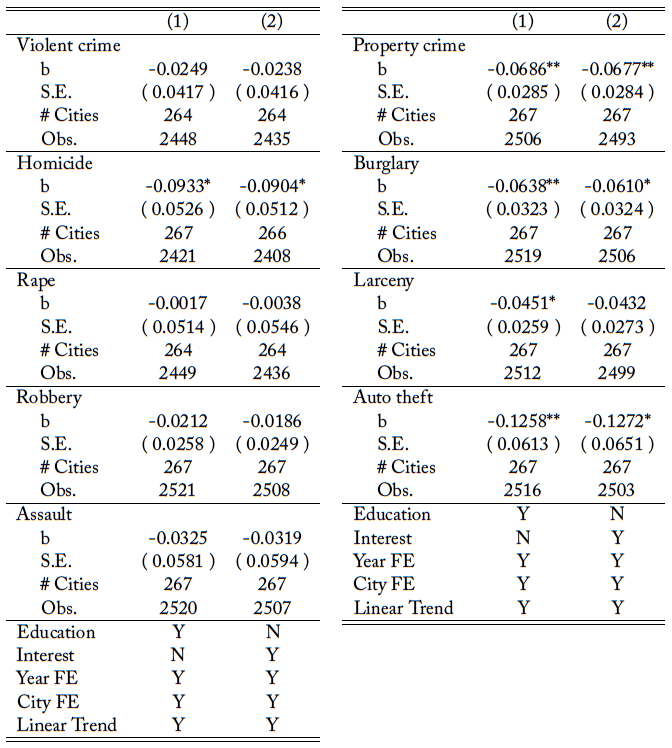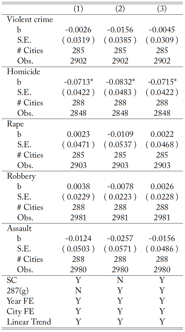 The second column controls for the city-specific linear time trend; this is the preferred specification. Most of the point estimates become small in an absolute sense, but this change reduces the standard errors of the estimates as well. As a result, the property crime rate still shows a significant difference induced by the policy and decreases by 6.3%. The homicide rate decreases by 8.3%, a larger effect than the estimator without trend terms.