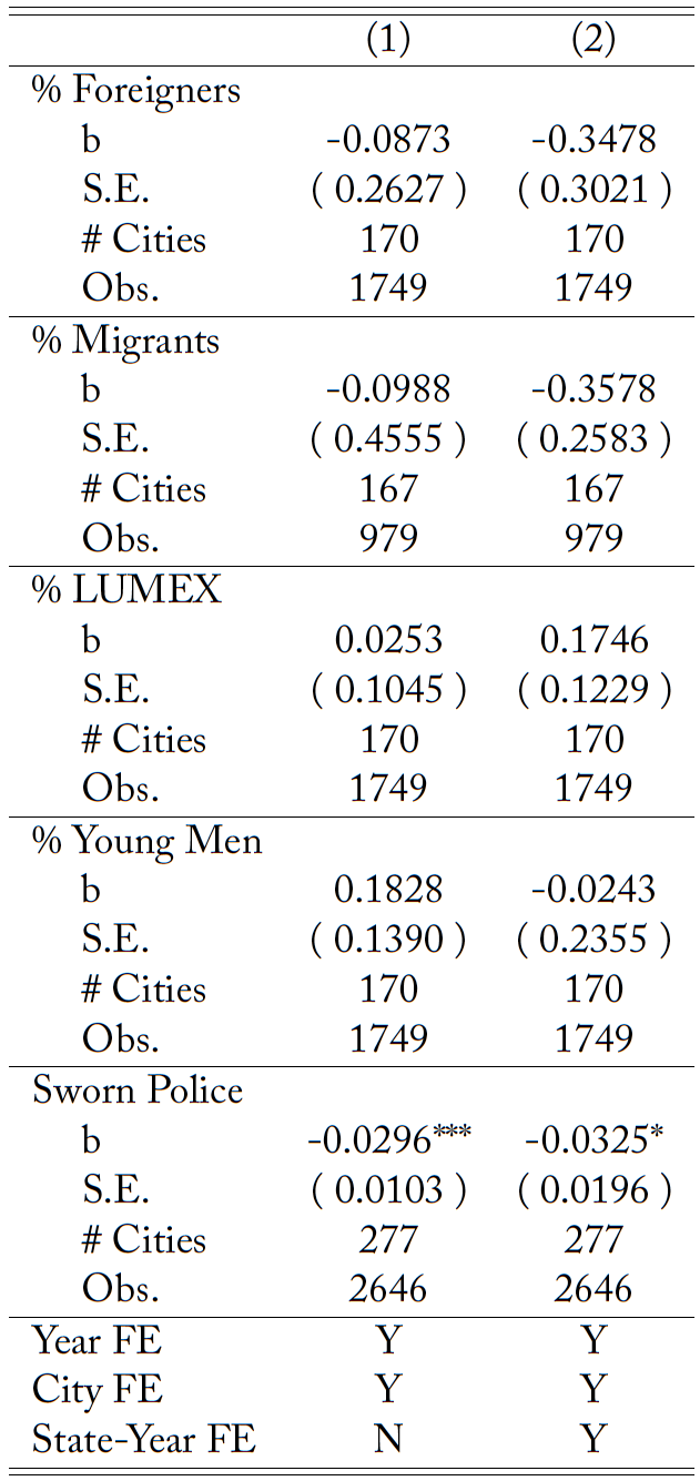 In summary, at least, there is no evident increase in foreigners, migrants, or the size of the police force in sanctuary cities. Hence, I conclude that a decrease in crime rates is not likely due to sorting or an increase in the police force.