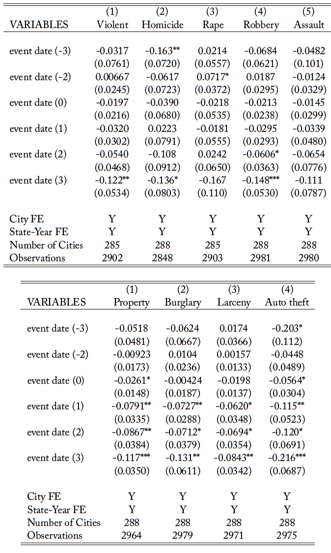 includes any city-year observation that passed the policy more than 3 years before (after). The estimated coefficients