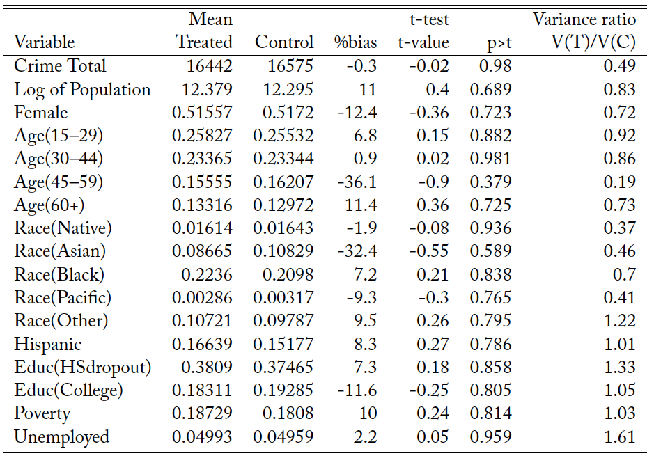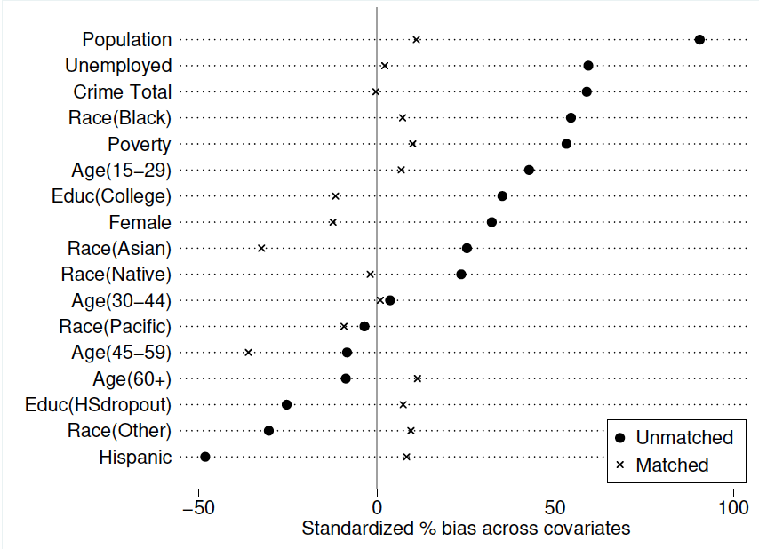 Note: Matching is based on the following characteristics: the sum of violent and property crime, log of population, female, age groups (15–29, 30–44, 45–59, 60 or above), racial groups (Black, Asian, Pacific Islander, Native American, Other race), Hispanic, less than high school degree, college or above degree, poverty rate, and unemployed.
