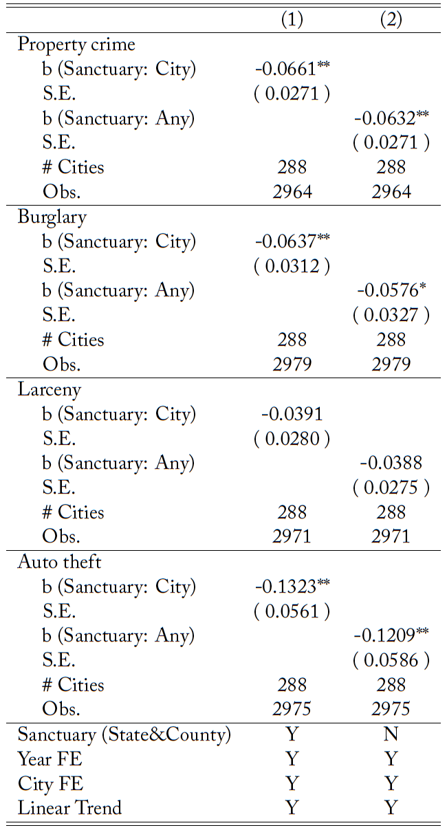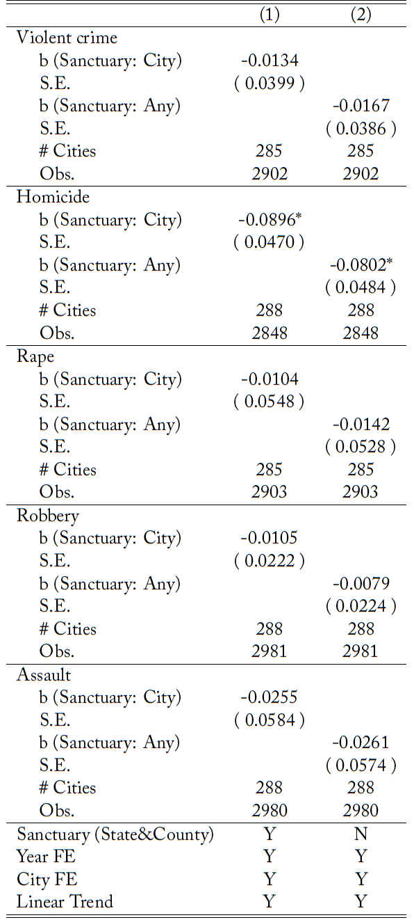 and the coefficient is the difference-in-differences estimates of the effect of sanctuary policies. Since the dependent variable is log of crime rates,