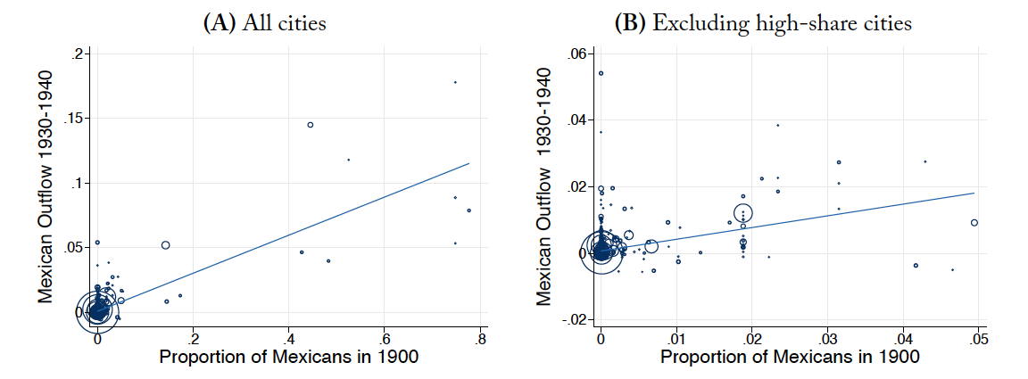 This figure shows the positive correlation between Mexican Outflow (defined in Equation (2)) and the county level share of Mexicans in 1900, i.e., before the repatriation shock. Panel A presents the scatter plot for all cities in our sample, and Panel B repeats the scatter plot after excluding cities with more than 5% share of Mexicans in 1900.