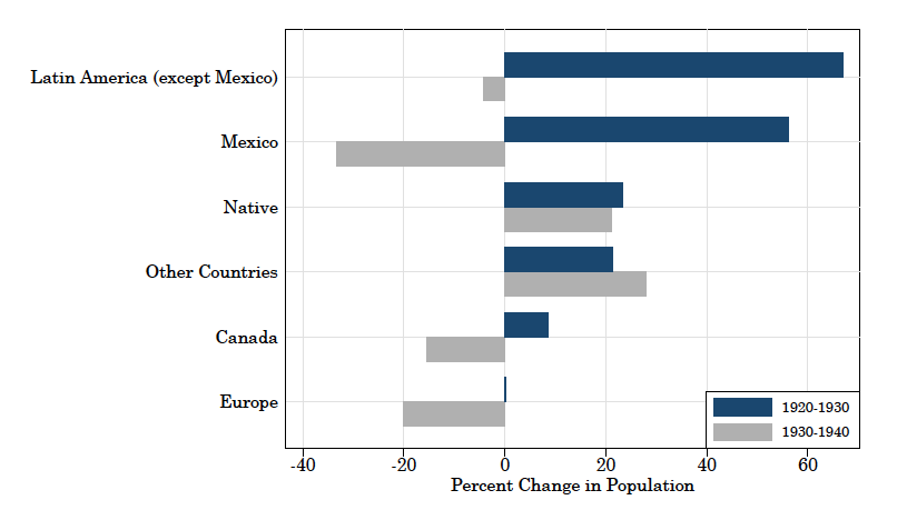 A helpful way to put the Mexican repatriation in perspective is to compare the outflow rates of Mexicans and immigrants from other ethnicities. Figure 4 examines the change in the US working-age population before (in dark blue) and after (in gray) the repatriation period for different ethnic groups. It shows that the massive Mexican outflow of almost 40% during the 1930–1940 period is unmatched by other groups. Their outflow is nearly twice that of the Europeans. Canadians—who also share a border with the US and could return more easily than other nationals—have half of the outflow rate. A final takeaway from Figure 4 is that non-Mexican Latin American immigrants experienced a substantially smaller outflow—even though the inflows of both Mexican and non-Mexican Latin immigrants had both grown at similar percentage rates in the previous decade.