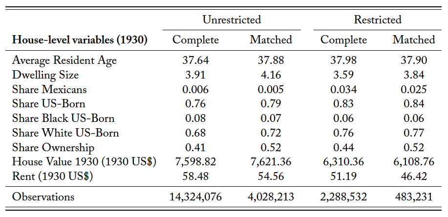 Table 1 presents the summary statistics of these variables and compares them across full-count 1930 Census data (column 1), the full address-matched sample (column 2), and the two sub-samples for states more affected by the Mexican repatriation (columns 3 and 4). When comparing the full data with our matched sample, we conclude that, on average, the dwelling characteristics are quantitatively similar across the two datasets. Our matching procedure seems to favor houses with larger shares of white or US-born residents, or houses owned in 1930. The variables on the average house value and rents are similar for the two samples. When comparing the state-restricted samples (columns 3 and 4), we observe larger shares of Mexican residents and smaller shares of US-born residents. We also observe smaller house values and rents due to the sample restrictions.
