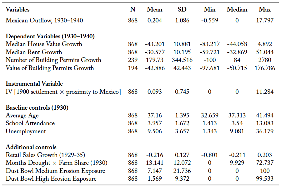 This table presents summary statistics for variables used in our empirical analysis. Mexican Outflow is constructed in Equation (2) and is the city-level change in the Mexican labor force between 1930 and 1940 divided by the city’s total working-age population in 1930. The dependent variables (growth in the number of building permits, growth in the value of building permits, growth of the median house value, and growth of median rent are the main city-level real estate market outcomes studied in our regressions and are described in detail in Section 3.2. Section 3.1 describes the construction of our instrumental variable, which combines the proximity to the Mexican border (calculated using travel times in 1930 throughout the US road network to the nearest Mexican border crossing station) interacted with the historical Mexican settlements (share of Mexican immigrants in 1900). The baseline control variables are from the 1930 Census and consist of the city-level averages of the worker’s age, school attendance status, and share of unemployed workers. We use as an additional control variable the county level retail sales growth (a measure for the Great Depression intensity) from Fishback, Horrace and Kantor (2005). We also control for the intensity of the Dust Bowl environmental catastrophe using county-level measures for months of drought interacted with the county’s farm land share from Fishback, Horrace and Kantor (2005), and the fraction of each county exposed to medium and high permanent soil erosion during the 1930s from Hornbeck (2012). Our full sample contains 868 US cities.