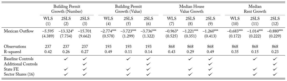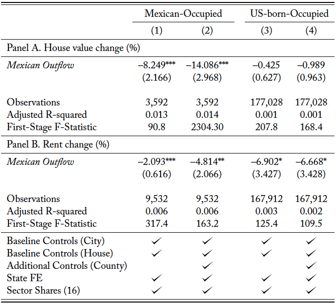 Therefore, a one standard deviation increase in exposure to the Mexican repatriation explains approximately 2.8% and 3.3% of the average decrease in house values and rents, respectively.
