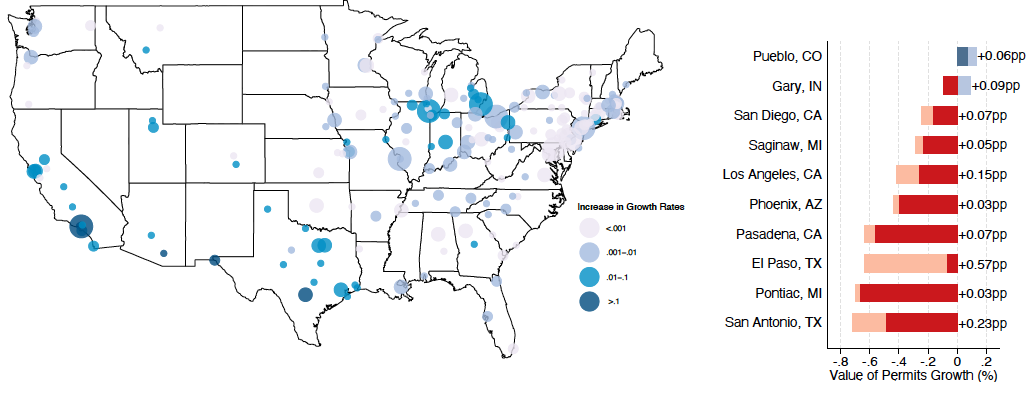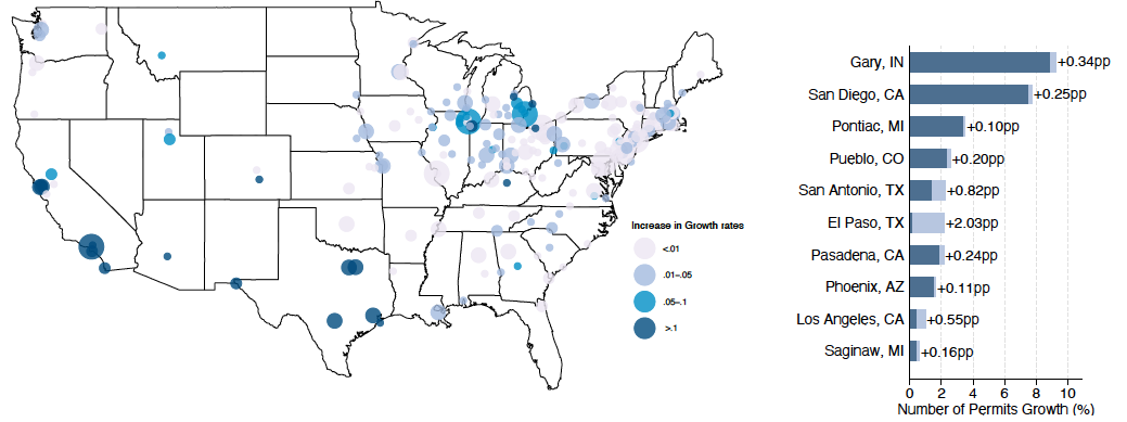 Descriptive Statistics. Table 2 presents sample summary statistics. All growth rates and share variables are presented in percentages. We can see that the average city experienced a decrease in the Mexican population equal to 0.2 percent of the city’s total population. There is substantial heterogeneity. San Benito and El Paso in Texas experienced the two greatest outflows. By 1940, they had lost Mexican population, equivalent to 17.8% (San Benito) and 14.5% (El Paso) of their total population. East Chicago, Indiana, part of Chicago’s commuting zone, was the seventh most affected city. As the East Chicago example shows, some cities distant from the Mexican border felt a measurable effect of the Mexican repatriation.23See Simon (1974) for a detailed account of the Mexican repatriation in East Chicago, Indiana. The author estimates that by 1932 over a third of the city’s Mexican population at the beginning of the decade had left the city. States on the list of top 10 of the most affected cities include Texas, California, Indiana, and Arizona.24Table B.1 in the Appendix shows the top 10 cities in terms of Mexican outflow between 1930 and 1940. Figures B.1, B.2, B.3, and B.4 in the Internet Appendix illustrate the geographic span of our housing variables with maps that show the series of building permits (number and value), median house values, and median rents for US cities. Despite the smaller number of cities shown in the building permits maps, our samples span a significant share of the US territory, accounting for the most populated and economically relevant cities in that period.
