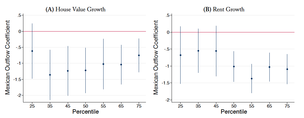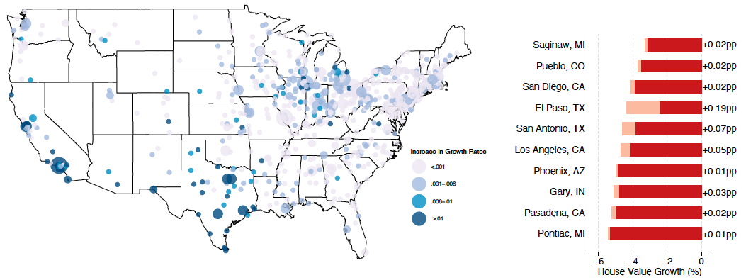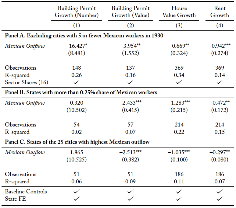 We find that the value of houses inhabited by Mexicans in 1930 devalued by an average of 8.2 percentage points between 1930 and 1940 for every percentage point drop in a city’s Mexican population. Rents on houses occupied by Mexicans in 1930 also fell by more than 2 percentage points for every percentage point of Mexican outflow. We find that the repatriation also mattered for the evolution of city-level housing market outcomes. The repatriation decreased the growth rates of coincident indicators (median house value or rents) and incidental indicators (number and value of building permits) of the city-level housing markets.