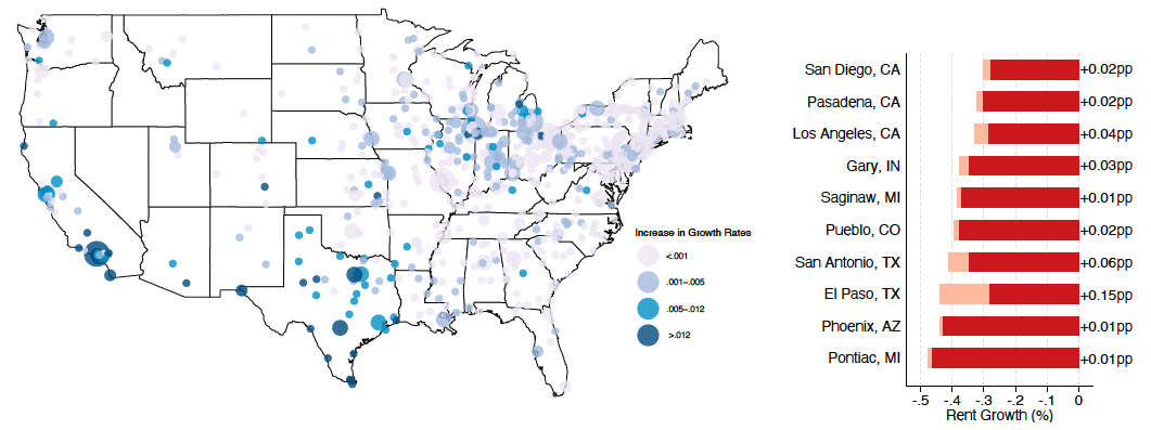 We can compare these results to the observed growth rates of median house values and rents in the period to put these results into perspective. On average, median house values decreased 43.2% while median rents decreased 30.6% in the decade.