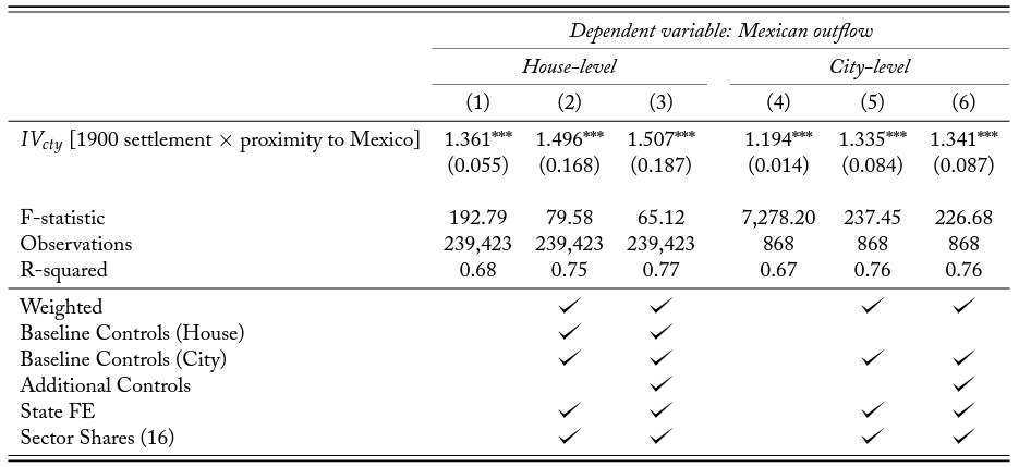 Nonetheless, the intensity of the repatriation efforts could be correlated with other city characteristics that might affect housing markets. To isolate the Mexican repatriation effects on real estate, we employ an instrumental variable (IV) approach. Our instrumental variable exploits patterns in the road infrastructure of 1930, combined with the historical presence of Mexican immigrants in the US at the turn of the century. More specifically, it combines a measure of exposure to the out-migration shock (the share of Mexican workers in 1900) with a measure of the cost of repatriating workers (travel distance based on the US road infrastructure in 1930). Our baseline specifications also include a series of control variables, including state fixed effects and sector employment shares to account for heterogeneous exposure to the Great Depression.7In other specifications, we include additional control variables to capture other important events that had profound economic effects in the period, such as the Dust Bowl and severe droughts discussed by Fishback, Horrace and Kantor (2005) and Hornbeck (2012).