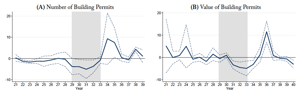 We also find that the repatriation depressed the growth rates of investment measures based on building permits. We find that a one standard deviation (1 percentage point) larger repatriation had lower growth rates for both the number (–13.3 percentage points) and the value (–3.7 percentage points) of building permits between 1930 and 1940. Slower growth in these outcomes suggests that the repatriation negatively impacted the expectations of future housing market conditions and local real estate activity, such as the construction of single-family homes and commercial buildings.