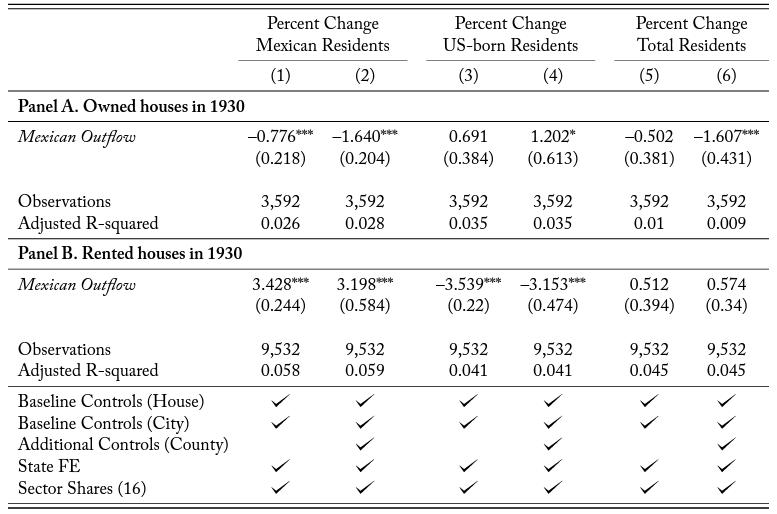 In this paper, we evaluate the effects of the United States’ Mexican repatriation of the 1930s on housing markets. Housing is a crucial channel through which migration affects the local economy and wealth distribution. However, most of what we know about the migration effects on housing comes from studies that focus on the inflows of immigrants. This paper is the first to quantify the impact of out-migration on housing empirically. Making this distinction when studying housing markets is indispensable. Because housing is durable, and housing investment is naturally irreversible, asymmetric effects on prices may arise.