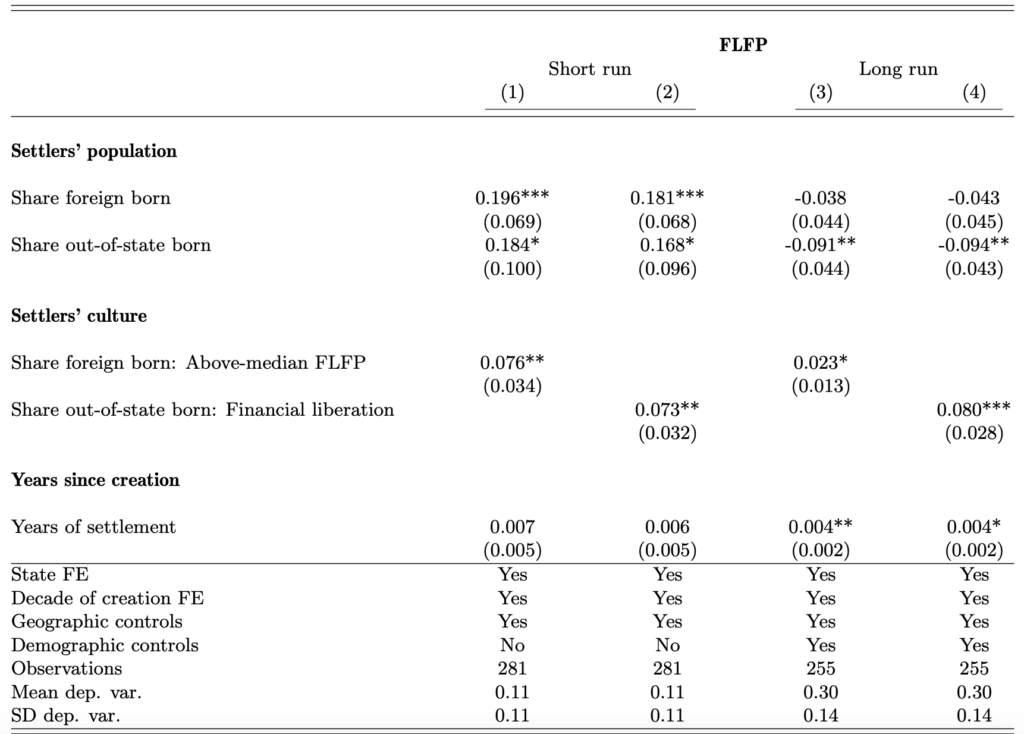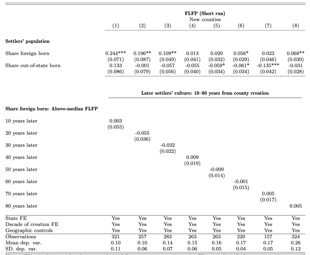 My analysis of the role of settlers’ culture in explaining variations in FLFP within states yields compelling evidence supporting the concept of cultural continuity and the persistence of norms over time, particularly within the primary sample of new counties. I establish a positive and statistically significant link between FLFP in newly established US counties, both in the short and the long term, and the cultural values of the initial settlers. These values are represented by factors such as historical FLFP (measured using various metrics) and women’s financial liberation in the settlers’ places of origin.