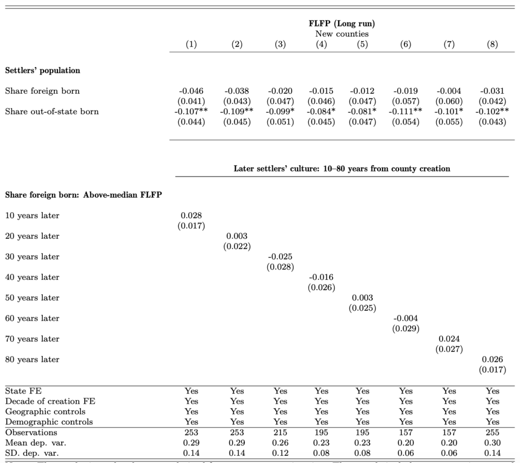 Several papers, including Bazzi et al. (2020), Grosjean (2014), Grosjean and Khattar (2019), and Baranov et al. (2023), show that initial cultural conditions matter. In addition, many papers since Fernandez and Fogli (2009) (including Blau et al. 2011 and Blau 2015) show that the culture of migrants persists, including in the case of FLFP. There are also other existing studies that have documented that the inflow of individuals with different cultural or political preferences shapes the values of receiving counties in the United States (e.g., Bazzi et al. 2021; Giuliano and Nunn 2021). This plausibly provides an answer to the question of whether we should expect a new culture to emerge in host societies. However, this research provides a novel framework to empirically examine the cultural legacy of first effective settlement and investigate cultural formation in settler societies.