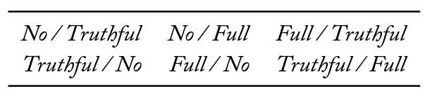 We vary the information sharing protocols within subjects. In a given session there were two information sharing protocols. Across the six sessions, we include all possible combinations and orders of these protocols. This allows us to control for order effects, as well as to have clean comparisons between each information sharing protocol. Table 2 illustrates this experimental design.