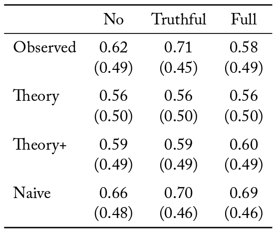 Second, to the best of our knowledge, we are the first to study information aggregation on an endogenous social media platform. Pogorelskiy and Shum (2019) imposes three social networks–null, complete, and partisans, where individuals can share information truthfully. We find that even with partisan preferences, groups primarily form complete networks.8On average individuals have 3.75 connections in the truthful information sharing protocol, and 3.35 connections in the full information sharing protocol.