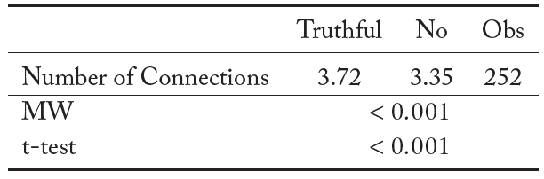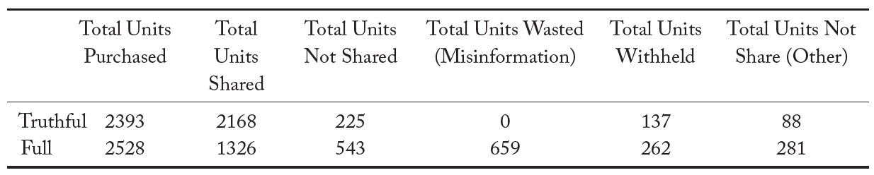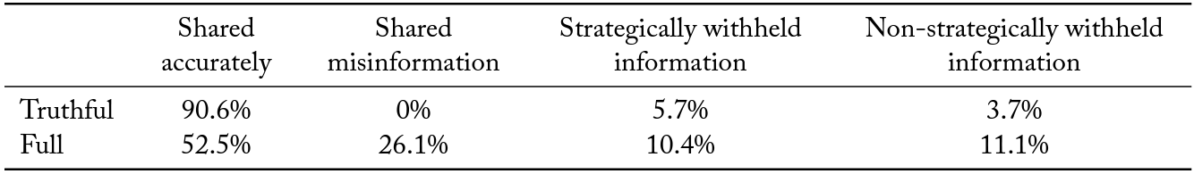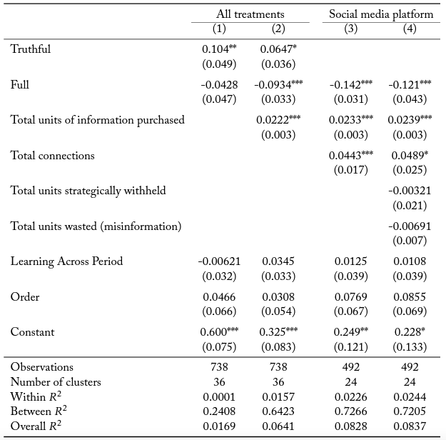 In the truthful information sharing protocol, group members share over 90% of the information purchased. In contrast, when misinformation is possible, only 50% of the information purchased is shared accurately on the social media platform. Further, we observe fewer connections on the social media platform when misinformation is permissible. In fact, the relatively low level of connections when misinformation is possible is the primary channel that explains the lower quality of decision making even after we account for the total information purchased by all group members. This result is of particular importance, as it demonstrates that social media platforms may have a vested interest in policing misinformation.