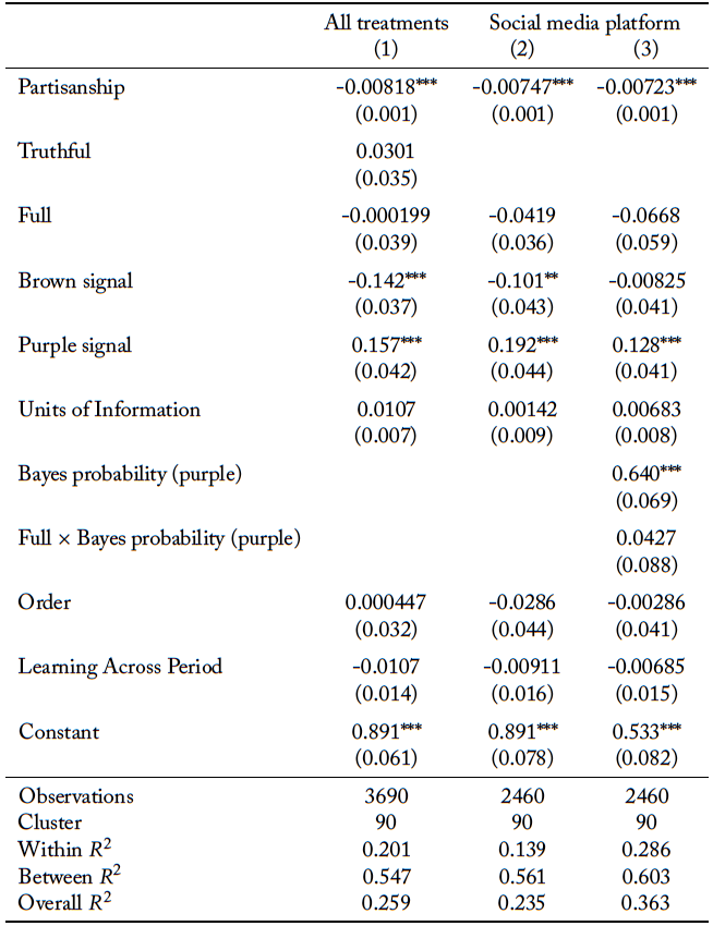 The results from the simulations are reported in Table 4. In the baseline treatment, the observed quality of group decision making is not statistically different from any of the three theoretical benchmarks, suggesting groups successfully aggregate information purchased by all individuals (median test, n.s.). That is, in the absence of social media, group outcomes are not statistically different from what we would expect if all informed bidders voted based on their signals. This is surprising, as the Naive benchmark strips some of the effects of partisanship out of the problem.