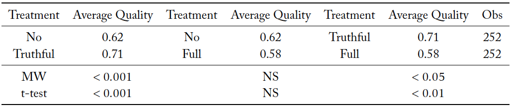 Groups in the truthful information sharing protocol use the social media platform to effectively aggregate information, beyond what is predicted by both Theory (Mann-Whitney, p < 0.001) and Theory+ (Mann-Whitney, p < 0.05). This indicates that the increase in the quality of group decision making relative to the baseline treatment is not entirely attributable to the increase in individual information acquisition. Further, the quality of group decision making is not statistically different from the Naive benchmark (Mann-Whitney, n.s.). This implies that the additional information voters gain via social media improves the quality of group decision making such that it is as if all informed voters simply voted sincerely. Strategic withholding of information on social media is not sufficient to erase the gains made available by the increase in information acquisition, which is caused by introducing social media.