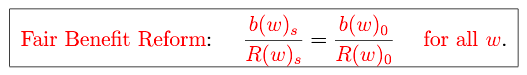 by solving the individual’s optimization problem where the reduction in benefits maintains the progressivity of Social Security as described previously in our paper. In both worlds, we use the survival probabilities associated with the 1960 cohort and we leave the Social Security tax rate at its original level. We compute the compensating variation associated with fair benefit reform, which tells us the fraction of lifetime consumption that an individual would give up, ex ante, to be born into a world with fair benefit reform rather than across-the-board benefit reform. We find