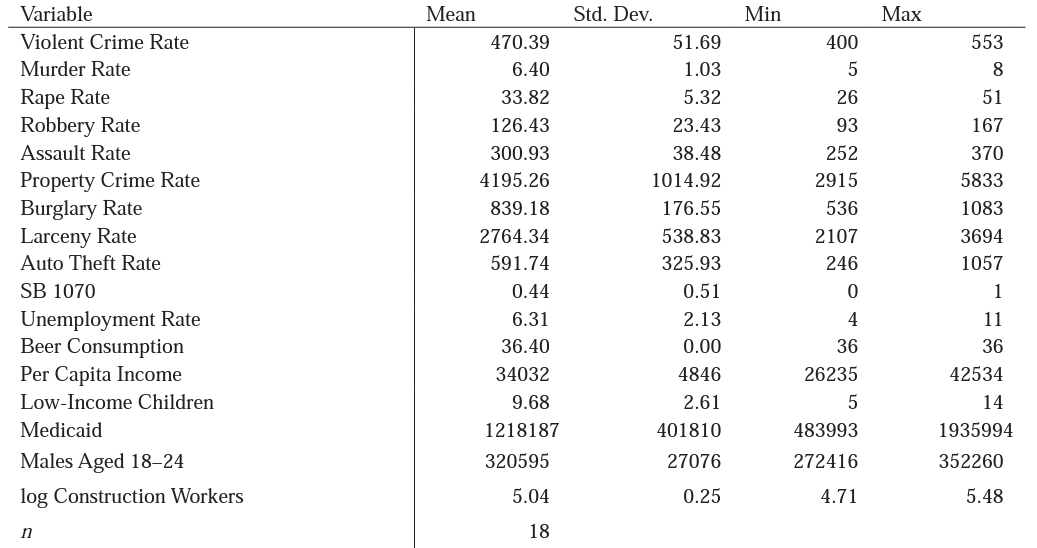 I included time and state varying covariates in order to control for differing conditions between states or over time that impact crime. Together, these variables should measure the conditions that are associated with crime. For my control variables, data came from multiple sources. For the state unemployment rate, the data came from FRED, the Federal Reserve Bank of St. Louis Economic Database. The variable beer consumption per capita came from the Beer Institute. Greater consumption of alcohol could also be associated with higher crime (Donohue and Levitt 2001). For a measure of per capita income, I used per capita income by state from the Bureau of Economic Analysis (BEA 2017). I collected poverty variables from the UKCPR National Welfare Data, which included the percentage of low-income children (UKCPR 2018). In order to control for the number of young males (the demographic with the highest offending rate), I included the number of males between 18 and 24 years old, from the US census intercensal demographic tables. While the per capita income and the unemployment rate would capture much of the effect of the 2007–2008 recession and the subsequent slow recovery, the recession had a disparate impact across industries that cannot fully be captured by per capita income. I also included the natural log of the number of workers employed in the construction industry, which came from the Bureau of Labor Statistics (BLS 2020). Because the BLS does not have data for Delaware, the District of Columbia, or Hawaii, I excluded these states from my sample. I included the percentage of the state population of Hispanic origin, accessed from the US Census Bureau State Characteristics Population Estimates (US Census 2020). The summary statistics for Arizona compared to the rest of the United States can be found in table 1 and table 2 in the appendix.