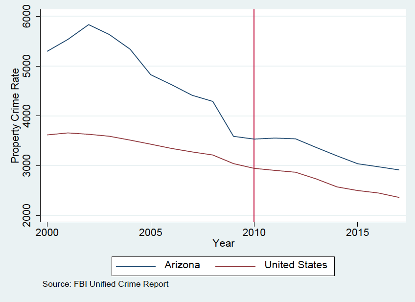 During most of the pretreatment period, the United States and Arizona experienced a period of economic growth. However, this ended in 2007 with the housing market bubble and subsequent recession. The recession began to affect the people of Arizona in 2008, just two years before SB 1070 was passed. An economic downturn with a high unemployment rate would have a profound impact on individuals and the decisions that they face. Unemployment decreases the opportunity cost and increases the relative benefit from committing a crime, according to the Becker model. Therefore, one would expect to experience an increase in crime during a recession, especially income-producing property crimes; this is in line with past findings (Freedman, Owens, and Bohn 2018; Pinnotti 2017).