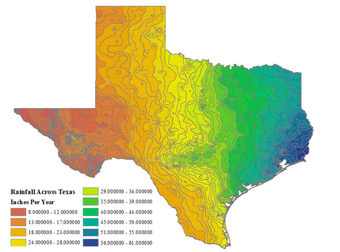 The regions in Texas with the most hydraulic fracturing activity (west and south) are also areas that experience low rainfall and groundwater recharge, meaning that withdrawals in these areas typically have a larger impact on water availability. Figure 3 provides a map of rainfall in Texas.28 A map of groundwater recharge rates, which exhibits similar spatial characteristics to the rainfall map in Figure 3, is available in Estaville and Earl (2008) or at http://texasaquaticscience.org/aquifers-springs-aquatic-science-texas/. The majority of hydraulic fracturing activity occurs in the arid parts of the state,29The major unconventional oil and gas plays and where hydraulic development is occurring in Texas can be seen in Figure 5. Figures 3 and 5 are helpful to characterize where water availability may affect water use in hydraulic fracturing and vice versa. Appendix B describes each of the oil and gas plays in more detail. and operators in these areas face two primary water problems. The first is locating and acquiring, i.e., sourcing, water in a timely manner before hydraulic fracturing stimulation occurs; and the second is disposing, treating, or reusing wastewater that is produced throughout the life of a well (Carr 2017). Due to the institutions governing mineral and groundwater rights in Texas, which treat them as private property (more on this in the next section), informal (and some formal)30Formalization has developed more recently after companies, such as MidstreamH2O and Solar Midstream, recognized a need for more efficient water transportation systems. Adoption of midstream oil and gas transportation methods has occurred, including permanent and temporary water pipelines. Sourcewater.com, an online water marketplace connecting water suppliers and demanders, is another example of innovation occurring these markets. markets have developed where in addition to leasing their mineral rights, many landowners lease their water rights and or sell groundwater to the industry for use in hydraulic fracturing.