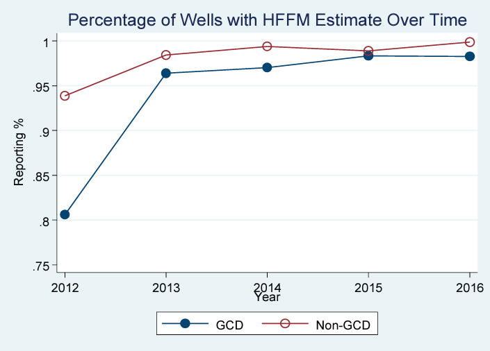 Roughly 95% of the well records in my final dataset had enough information for PV to estimate a HFFM. However, the actual proportion of well records detailing any information on water use by type is lower than this. Using an alternate metric for the level of reporting, equal to one if any information on water type was reported and zero otherwise, about 79% of well records contained at least some information on water type beyond a generic total water volume: