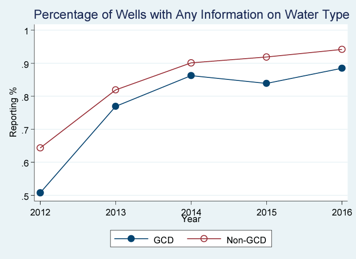 Figure 7 provides information on the rates of reporting of water use over time in GCD and non-GCD areas, and for each of the two reporting metrics. In both cases, reporting improved over time, potentially attributable to learning or a more mechanized and increasingly manufacturing-style approach to drilling and completions. In panel a), PV estimated a HFFM for a larger proportion of well records over time, and in panel b), an increasing proportion of well records contained information on water use by type. However, there is still a clear difference in the level of reporting across GCD status, which persists over the duration of the sample and provides preliminary evidence of strategic reporting.63Although my data suggest only a minimal amount of recycled wastewater is being reused, reporting the use of freshwater alternatives can be beneficial to operators in order to give them, and the industry in general, a “greener” public image. However, if it is being used, I am not seeing it being reporting by operators in Texas.