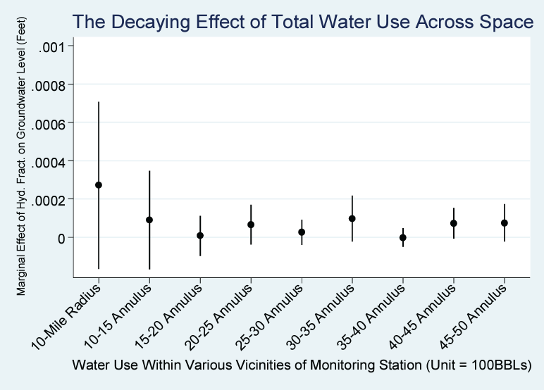 This specification enables me to estimate the cumulative effects of water use in hydraulic fracturing, relative to monitoring stations absent nearby hydraulic fracturing activity.73 Ex ante, it is unclear which effect should be bigger, the effect from lagged (contemporaneous) or cumulative water use. After discussions with a hydrologist, it was made clear that the effect of lagged contemporaneous water use should be expected to be larger, since under the cumulative case, aquifers are able to recharge more over a longer period, so a one-unit increase in monthly total water use should have a larger immediate effect than a one-unit increase in the cumulative total water use that may be spread across a longer horizon.