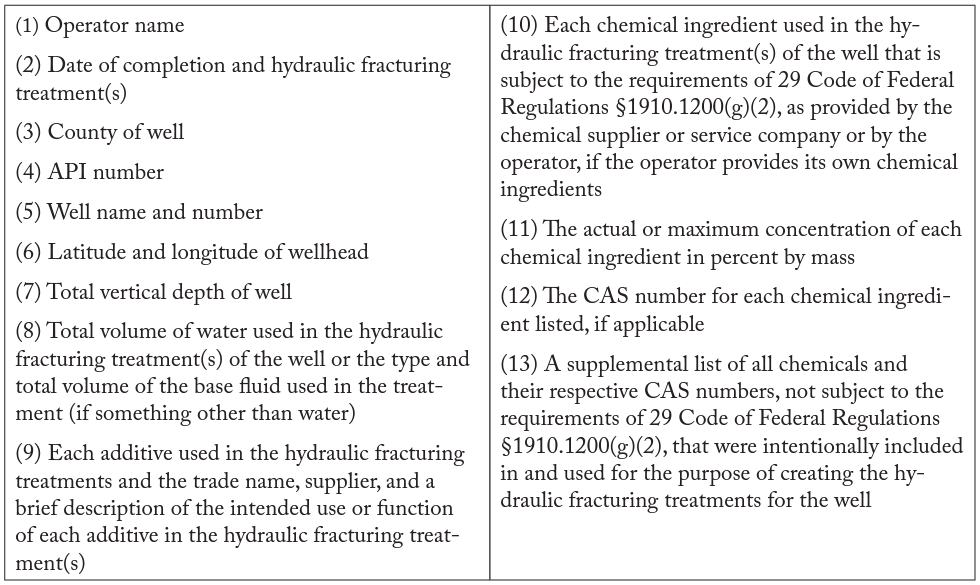 Konschnik, K., and A. Dayalu. 2015. “Hydraulic Fracturing Chemicals Reporting: Analysis of Available Data and Recommendations for Policymakers.” Energy Policy, 88: 504–514.