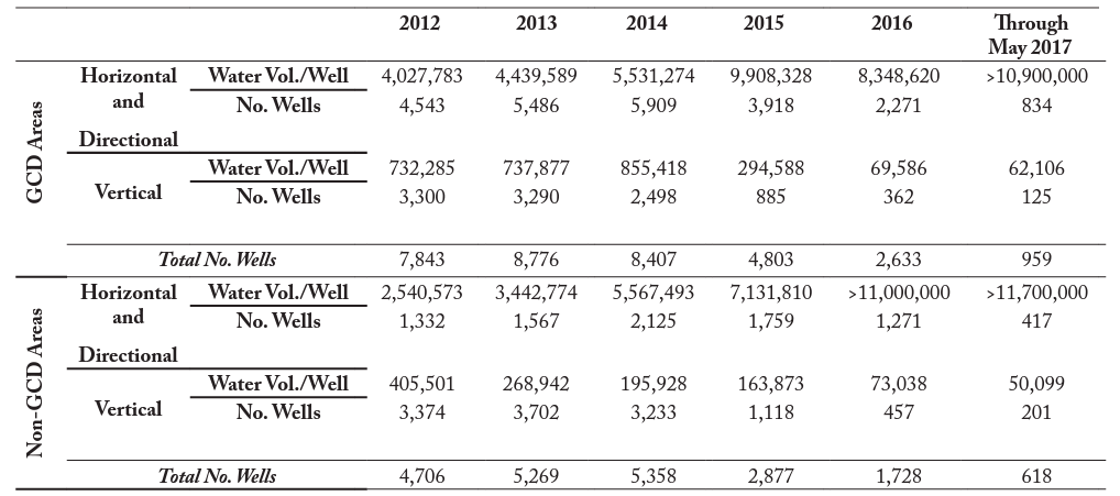 Table 2 provides detailed information on the number of wells completed in Texas since 2012 and the reported water volumes used, both by drill orientation and across GCD status. Given that more wells were completed in GCD areas than non-GCD areas in each year of the sample, it is clear that the majority of hydraulic fracturing activity is occurring in more arid parts of the state, where the geology is more favorable, and groundwater availability is of greater concern.55 One exception is the Permian Basin, where more wells were drilled in non-GCD areas each year, although the entire basin is located in a region with little annual rainfall and low groundwater recharge (see Appendix B.1). Median reported water volumes used in horizontal and directionally drilled wells located in GCD areas were also higher than those in non-GCD areas for 2012, 2013, and 2015, but were otherwise higher in non-GCD areas, potentially indicative of more water availability, easier access to water, or both.