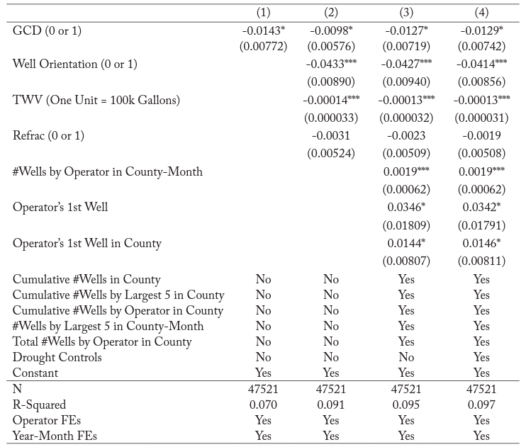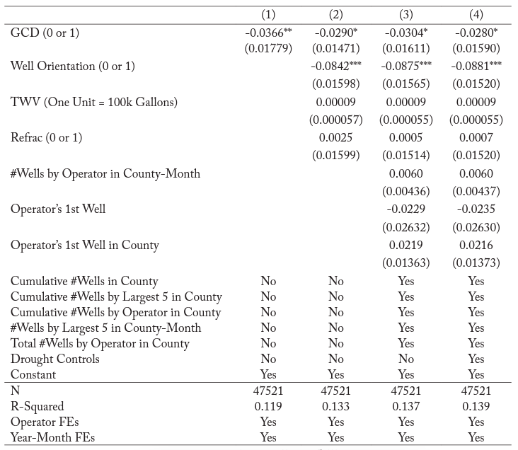 In each model, I find that if a well was stimulated in a GCD there was a decline in the likelihood of an operator reporting detailed information on water use—statistically significant at the 10% level in all specifications. In column 2, total water volume was added and shows that a marginal increase in the total water volume (TWV) used in well stimulations is associated with a small, but statistically significant decline in the likelihood of an operator reporting information on water use beyond what is required. In column 3, an indicator was added to control for whether the well was a re-fracture, as well as additional controls for the number of wells drilled by the largest three operators in the same county-month that well i was completed, whether the well was an operator’s first well, and the operator’s first well in that county.