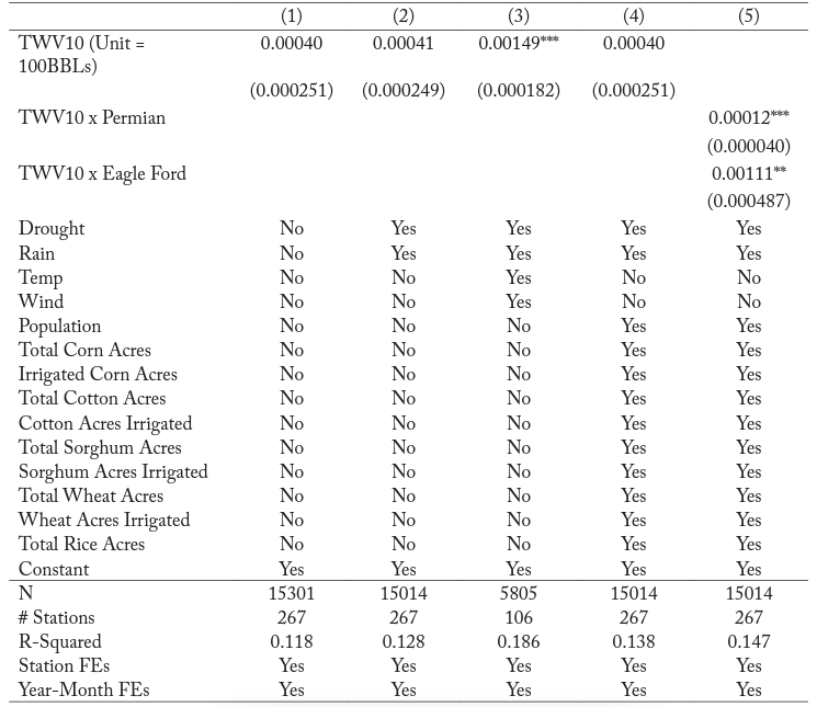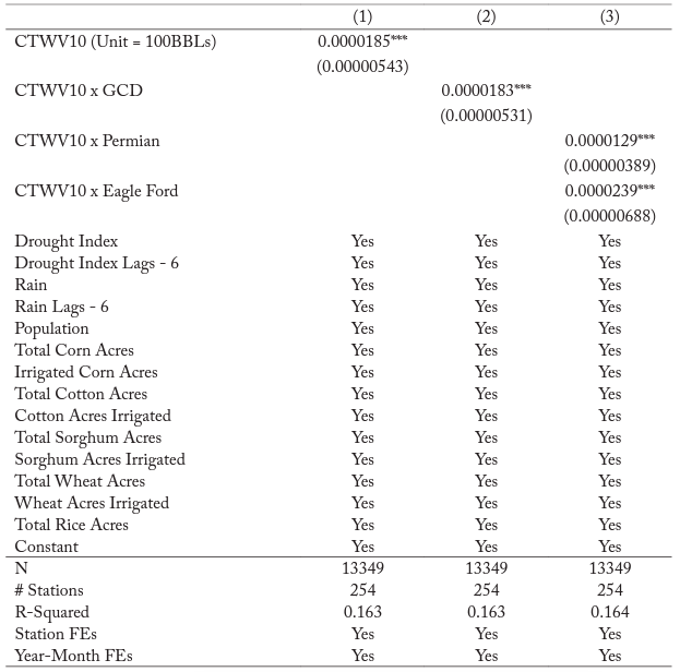 After testing for a causal effect from hydraulic fracturing water use occurring over a short period, it is clear that cumulative water use within the vicinity of a monitoring station is likely to have a causal relationship with groundwater levels as well. Using the total water volumes in each month, I create a new term, CTWV10i,t, which represents the cumulative water use that has occurred within 10 miles of monitoring station i at time t, and I re-specify equation (2) as follows, omitting the annulus terms: