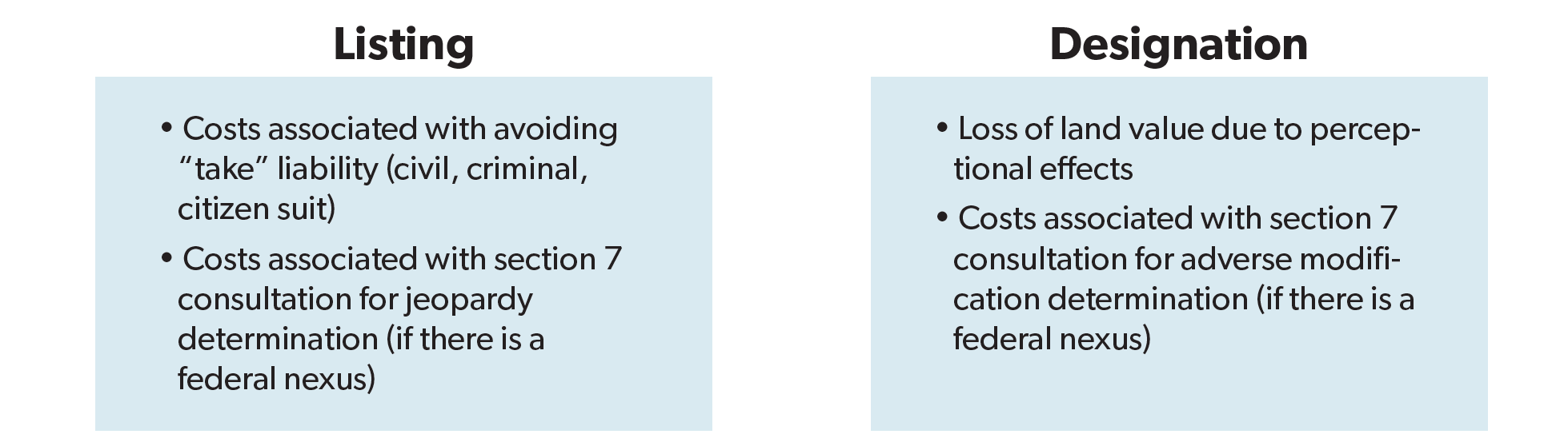 But this signaling function also comes with cost. If the agencies designate an area “where federal agencies can focus their conservation programs and use their authorities to further the purposes of the Act,”139Ibid. then it is more likely that such an area will be subject to future regulation. In some states, like California, a critical habitat designation can affect the environmental analysis conducted under the state’s environmental quality act.140California Public Utilities Commission, Proponent’s Environmental Assessment West of Devers Upgrade Project, October 2013, 4.4-101, https://www.cpuc.ca.gov/environment/info/aspen/westofdevers/pea/4.04_bio_part2.pdf. These potential issues can decrease the value of the land, even if the landowner never seeks a federal permit.141Auffhammer et al., “Economic Impact,” 191. Yet the Services often do not analyze these costs.